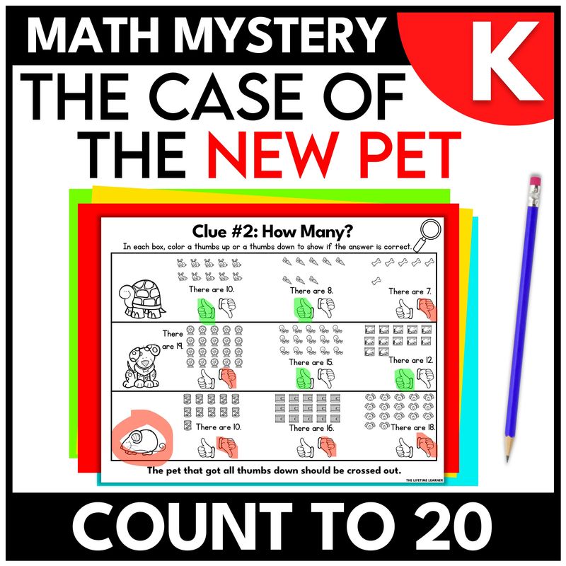 Pet math mystery kindergarten activities have students practice the skill: count to 20. This resource blends learning with a pet-themed storyline that feels like a kindergarten math escape room—without the stress of hours of teacher prep. Teachers simply print and go (or assign digitally), and students solve math clues to crack the case.