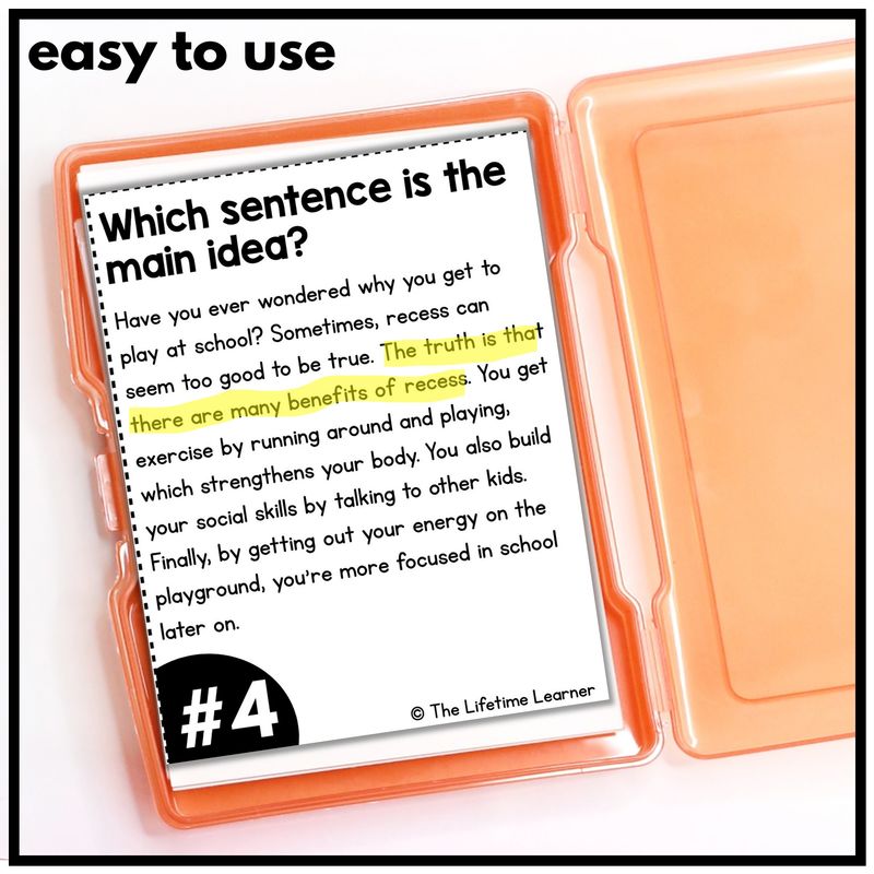 Main idea can be one of the trickiest skills for students to master. Task cards provide practice in small, approachable chunks, which makes this skill less intimidating. Each short paragraph allows students to focus on the most important sentence without becoming overwhelmed by too much text at once.