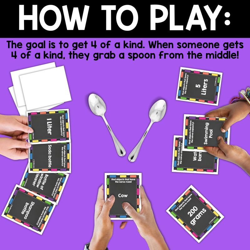 Once a player has four matching math cards, they grab a spoon. The other players must grab the remaining spoons before they run out.