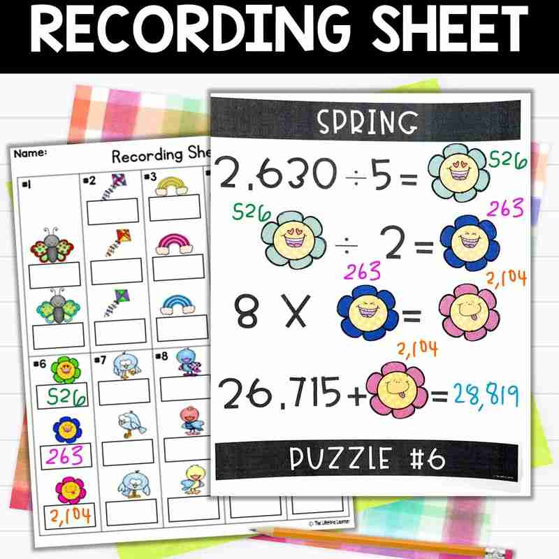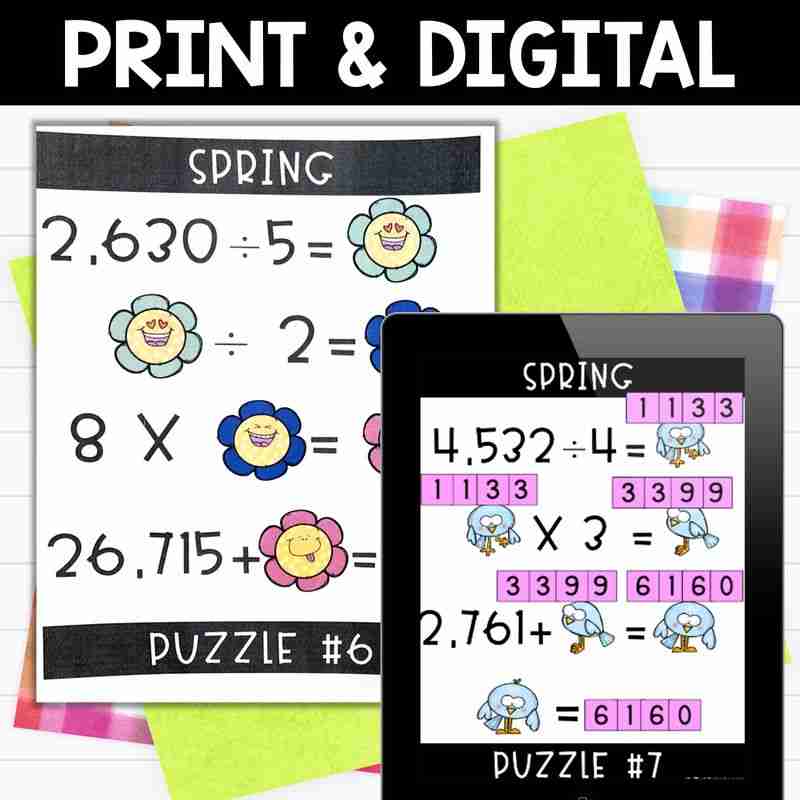 These aren’t simple fact-drill worksheets. Each puzzle requires students to apply multi-digit multiplication and division in problem-solving contexts. Skills reinforced include: