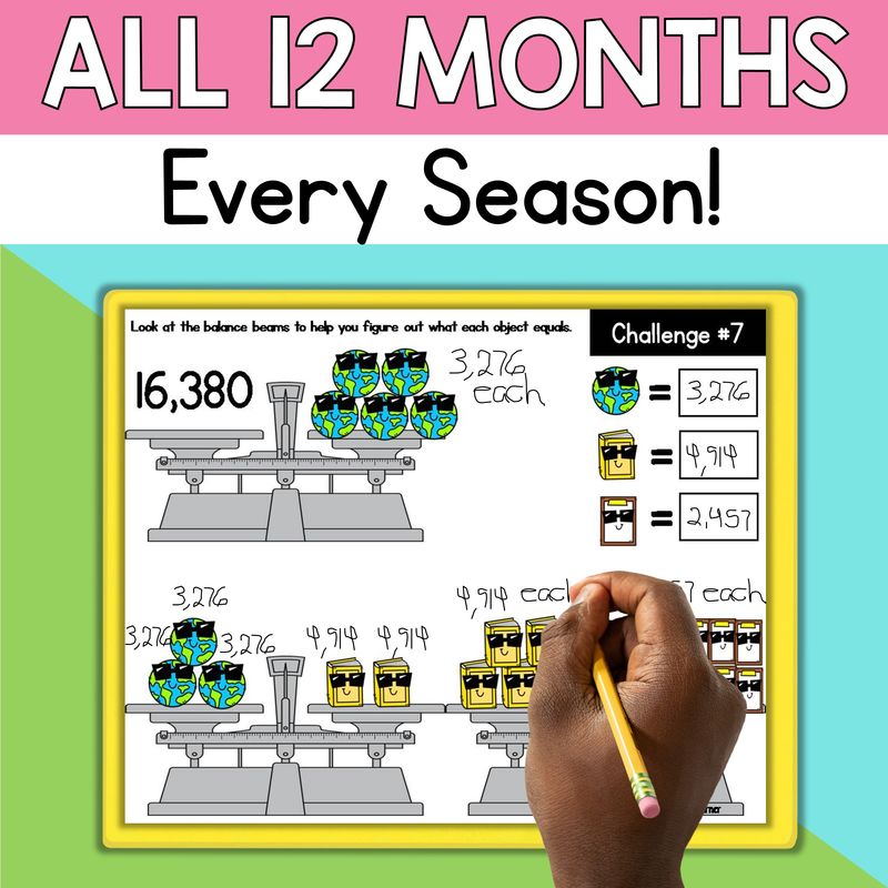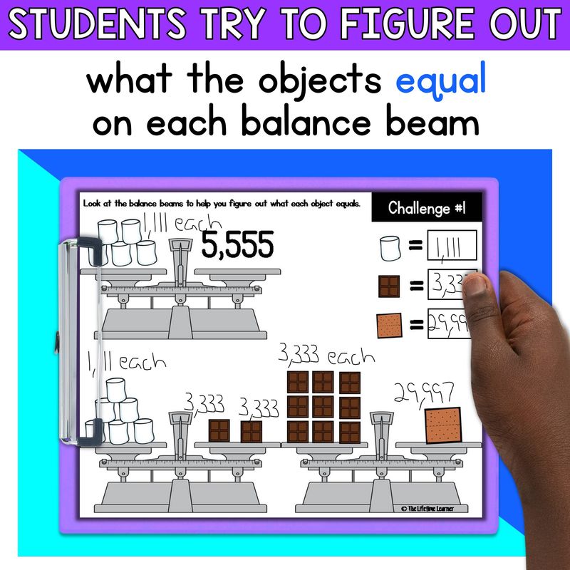 This bundle works because it transforms higher-level math practice into a problem-solving activity. Students aren’t just running through steps of long division or multiplication—they’re thinking critically about how numbers fit together to balance the beam.