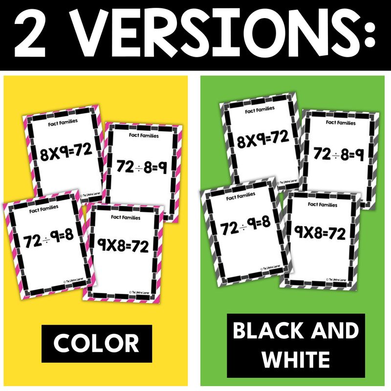 This game includes two versions: one where students match the four equations in a fact family, and another where they solve for missing factors in order to place equations into the correct family.