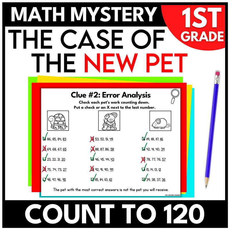 Pet math mystery 1st grade activities are the perfect way to practice the skill: count to 120. This resource turns learning into a storyline that feels like a first grade math escape room—without the stress of hours of teacher prep. Teachers simply print and go (or assign digitally), and students solve math clues to crack the case.