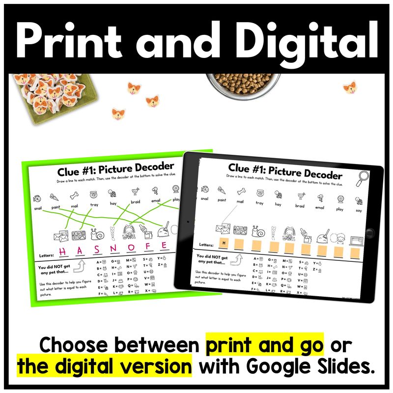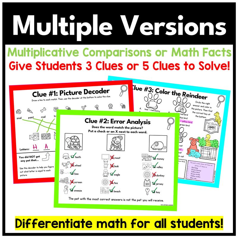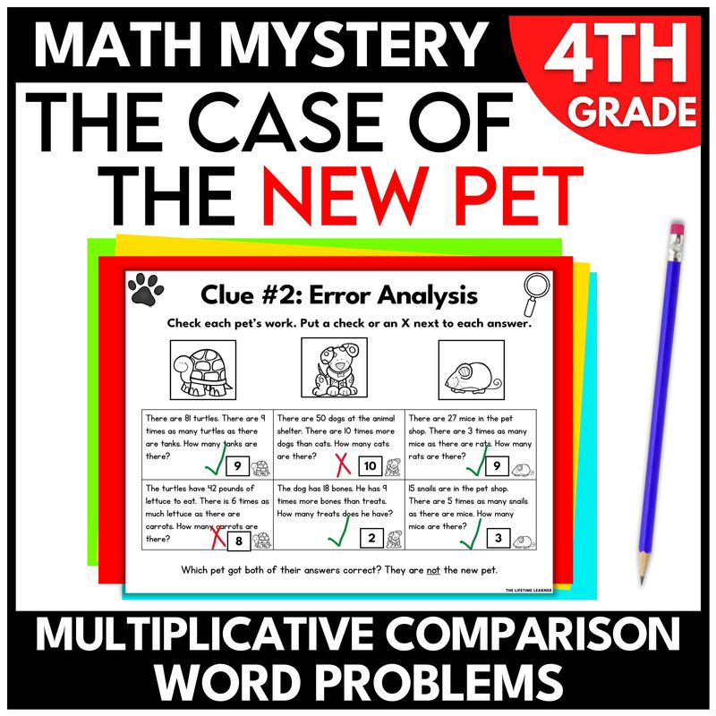 Pet math mystery 4th grade activities are the perfect way to have students practice the skill: multiplicative comparison word problems. This resource turns learning into a storyline that feels like a fourth grade math escape room—without the stress of hours of teacher prep. Teachers simply print and go (or assign digitally), and students solve math clues to crack the case.