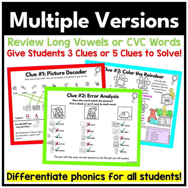 Looking for differentiation? Each resource includes a bonus mystery focused on CVC words. While most of the class works on the main phonics skill, students who need extra practice with CVC words can complete this version instead. The bonus mystery is designed to look and feel exactly like the main one, with the same style of clues and the same final solution. This way, every student is engaged in the same mystery storyline, but the skill level can be adjusted to meet their needs seamlessly.