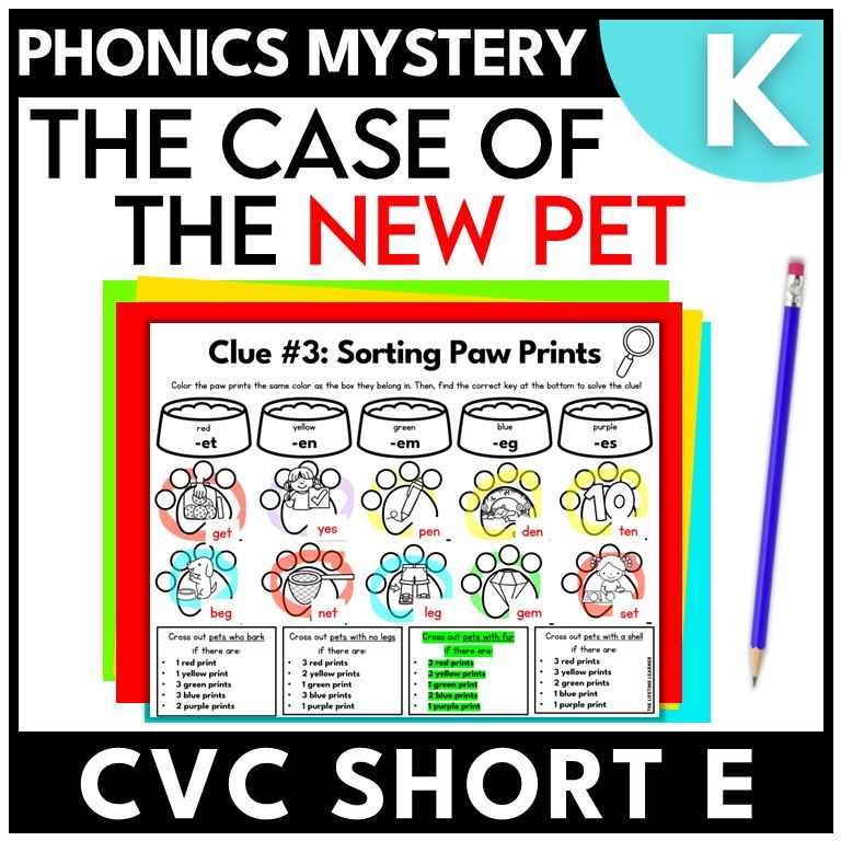 This pet phonics mystery kindergarten activity is a fun and engaging way to practice the skill: CVC short e words! Designed as an escape room game, student detectives solve clues that are engaging and fun. These printable and digital phonics worksheets turn reading practice into an interactive mystery game for kindergarten and 1st grade. Use it during whole group, small groups with teacher support, or as part of a classroom transformation.
