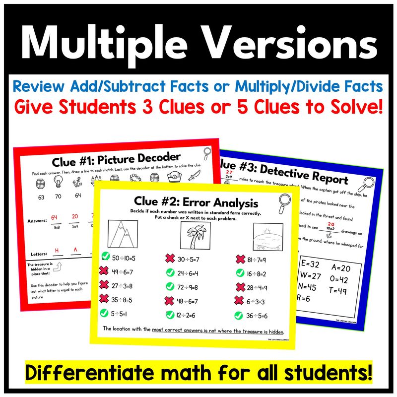 Clues are interchangeable! You can swap out one clue from the addition/subtraction mystery with a multiplication/division clue to customize the experience for your students.