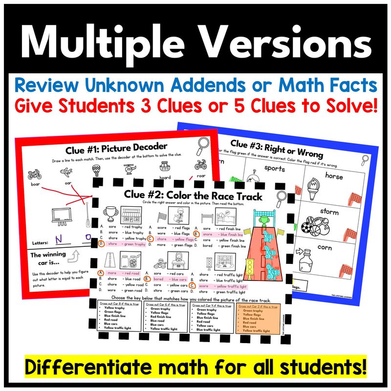 Race Car math mystery 1st grade activities are the perfect way to practice the skill: unknown addends. This resource turns learning into a storyline that feels like a first grade math escape room—without the stress of hours of teacher prep. Teachers simply print and go (or assign digitally), and students solve math clues to crack the case.