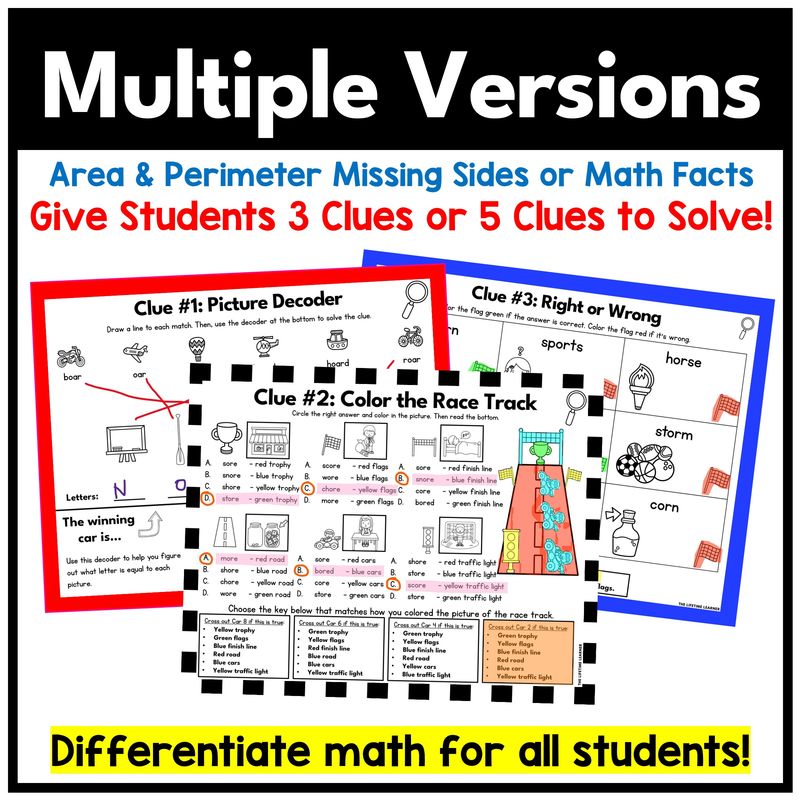 Race Car math mystery 3rd grade activities are the perfect way to practice the skill: area and perimeter missing sides. This resource turns learning into a storyline that feels like a third grade math escape room—without the stress of hours of teacher prep. Teachers simply print and go (or assign digitally), and students solve math clues to crack the case.