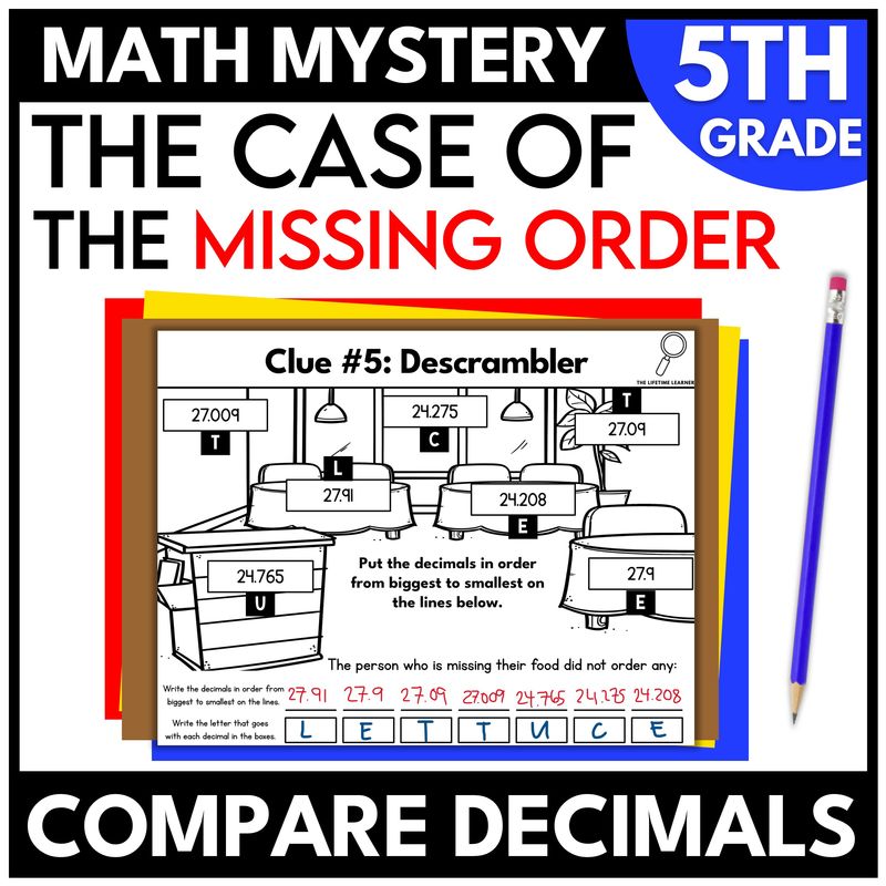 Restaurant math mystery 5th grade activities are the perfect way to keep students practicing the skill: comparing decimals. This resource turns learning into a storyline that feels like a fifth grade math escape room—without the stress of hours of teacher prep. Teachers simply print and go (or assign digitally), and students solve math clues to crack the case.