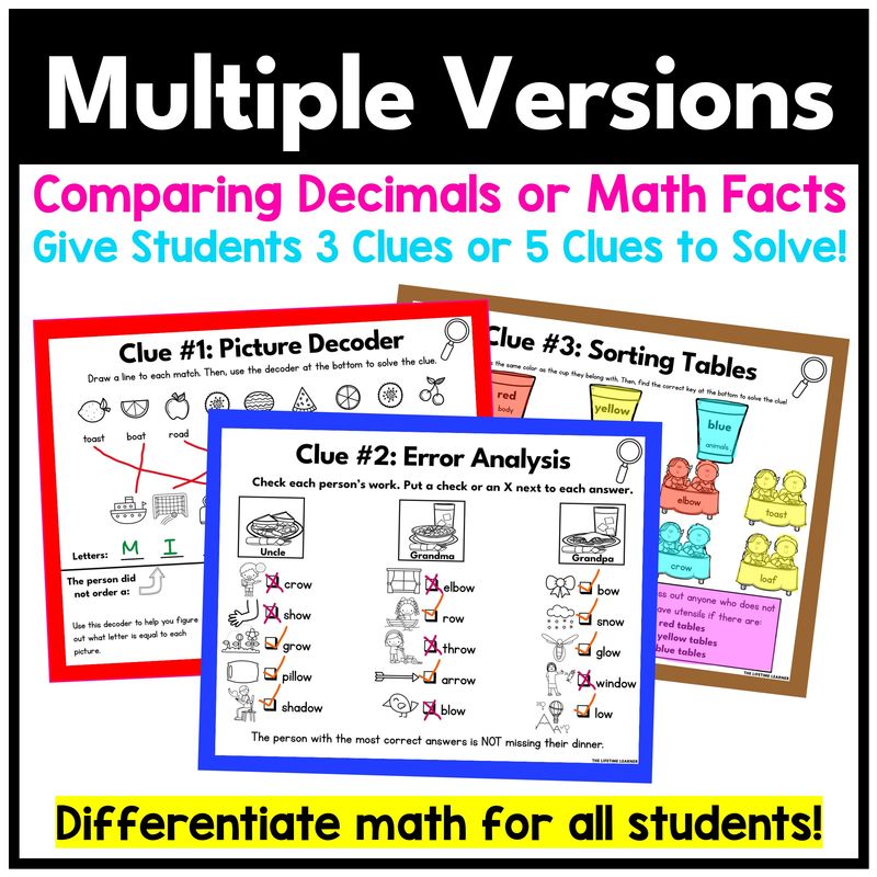 The main mystery and the extra mysteries feature the same clues but focus on different skills. This design ensures that students of varying abilities can work on different mysteries without realizing they are tackling different challenges.