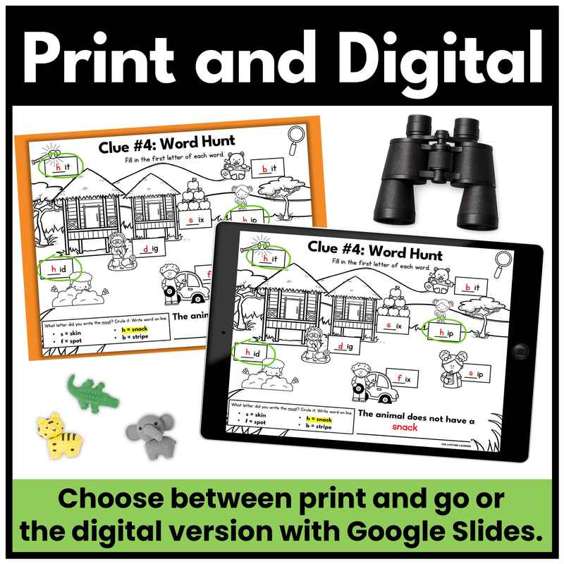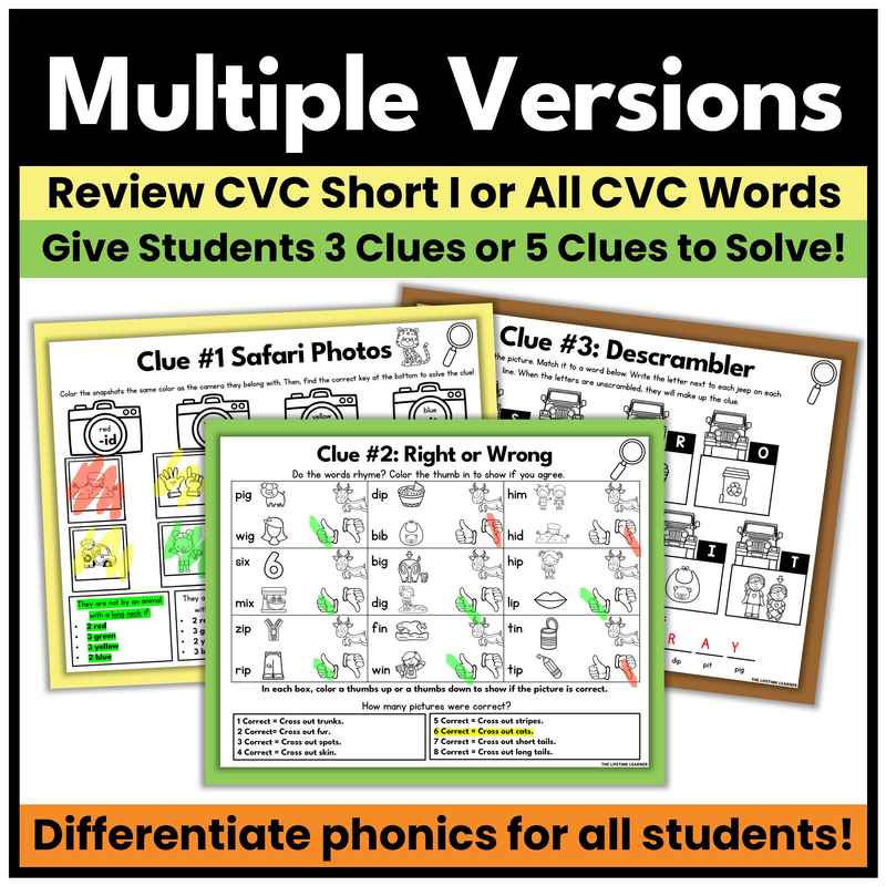 This safari phonics mystery kindergarten activity is a fun and engaging way to practice the skill: CVC short i words! Designed as an escape room game, student detectives solve clues that are engaging and fun. These printable and digital phonics worksheets turn reading practice into an interactive mystery game for kindergarten and 1st grade. Use it during whole group, small groups with teacher support, or as part of a classroom transformation.
