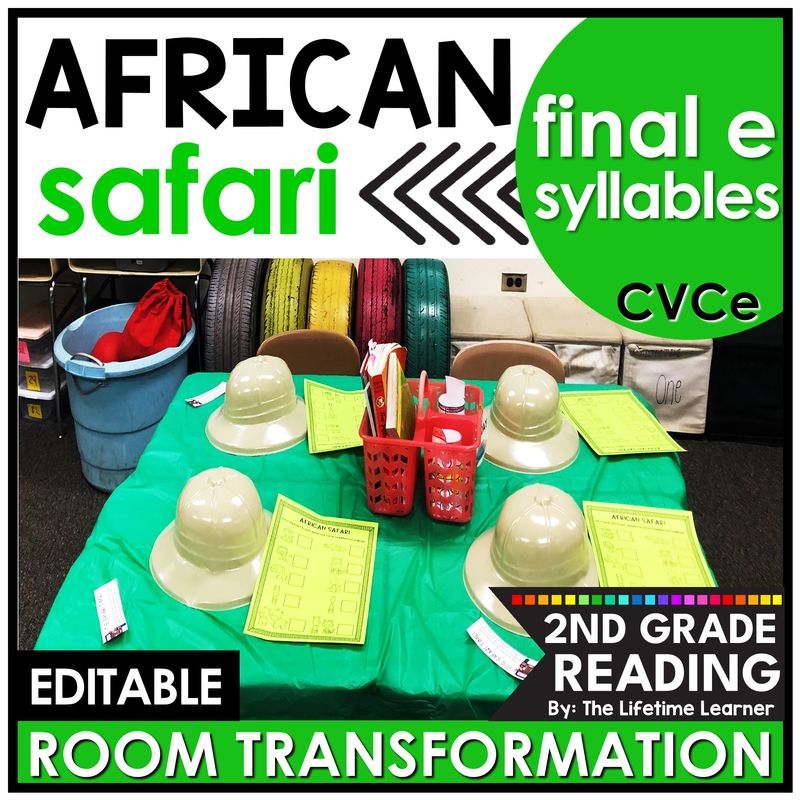 It’s African safari day in this engaging 2nd grade room transformation or reading escape room! Second grade students review final e syllables (also known as silent e syllables or CVCe syllables) in a FUN way with tons of zoo animal themed activities! This safari animal classroom transformation has silent E syllable worksheets, phonics activities, and 2nd grade decodable readers. It’s the perfect phonics activity to use on a safari or zoo day. Print, digital, and editable versions are included.