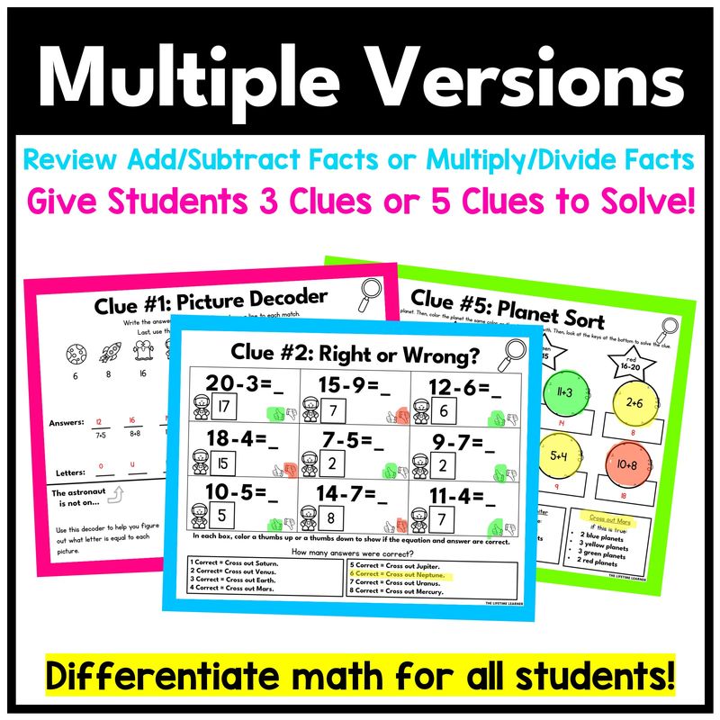 Space math fact mystery activities are the perfect way to build math fact fluency while keeping students excited and engaged as they practice addition and subtraction facts OR multiplication and division facts. This activity turns routine fact practice into a storyline that feels like a math escape room—without the stress of hours of teacher prep. Teachers simply print and go (or assign digitally), and students solve math clues to crack the case.