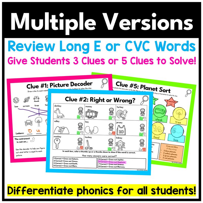 Looking for differentiation? Each resource includes a bonus mystery focused on CVC words. While most of the class works on the main phonics skill, students who need extra practice with CVC words can complete this version instead. The bonus mystery is designed to look and feel exactly like the main one, with the same style of clues and the same final solution. This way, every student is engaged in the same mystery storyline, but the skill level can be adjusted to meet their needs seamlessly.