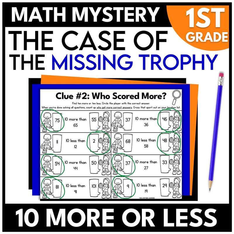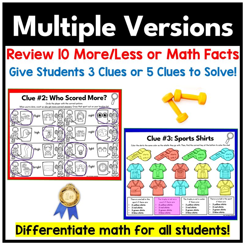 Sports math mystery 1st grade activities are the perfect way to practice the skill: 10 more, 10 less. This resource turns learning into a storyline that feels like a first grade math escape room—without the stress of hours of teacher prep. Teachers simply print and go (or assign digitally), and students solve math clues to crack the case.