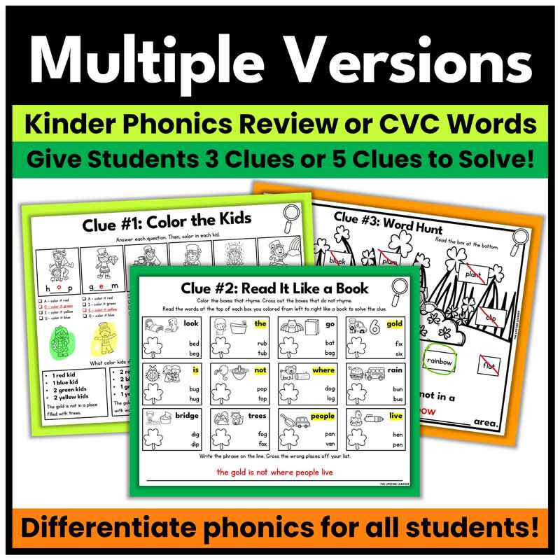 The St. Patrick’s Day kindergarten phonics worksheets (aka clues!) focus on: