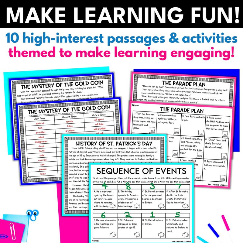 Are you looking for ELA March reading passages students will actually WANT to read? Make learning FUN with these 10 St. Patrick’s Day reading comprehension passages and activities! Use this “leprechaun add-on pack” of informational and literature reading passages to spiral review fiction and nonfiction reading skills during your ELA block OR during a Saint Patrick’s Day classroom transformation. They’re appropriate for 3rd, 4th, and 5th graders.