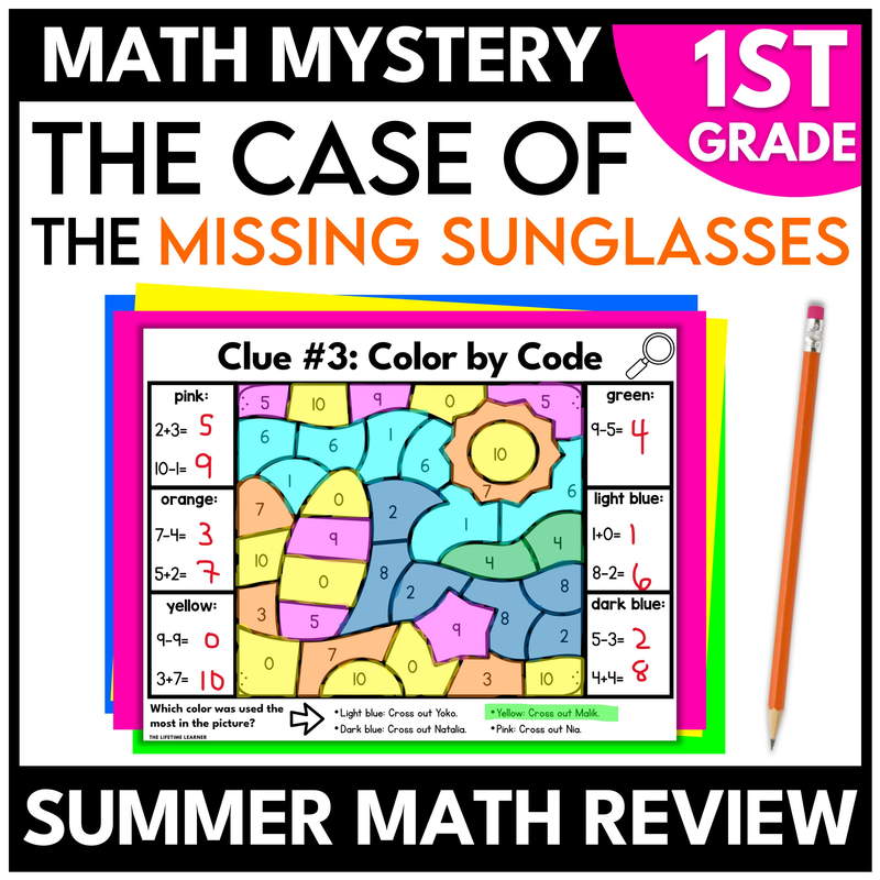 Teachers want math review activities that keep students focused while practicing skills. This first grade summer math mystery transforms worksheets into an interactive game where every problem brings students closer to solving the mystery.