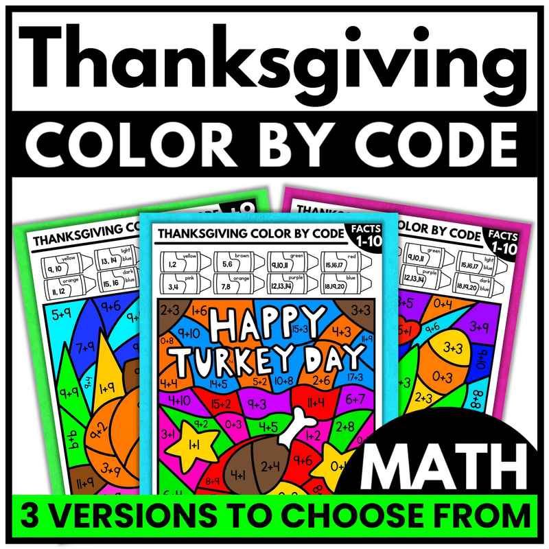 This Thanksgiving color by code math resource is available in three versions, each with 28 pages of print-and-go practice: