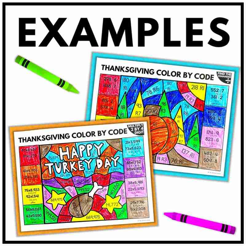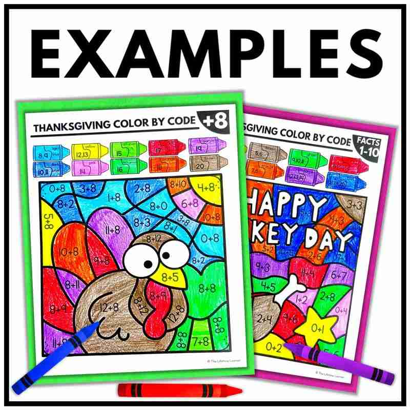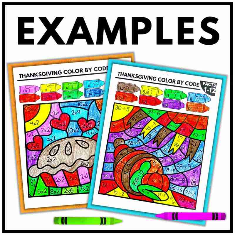 Each Thanksgiving math set includes 28 themed color by code worksheets: