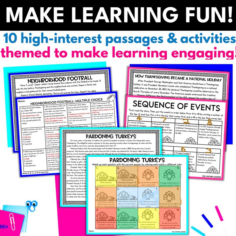 Are you looking for fall reading passages and questions students will WANT to read? Make learning FUN with these 10 Thanksgiving reading comprehension passages and activities this November! Use the “add-on pack” of fiction and nonfiction reading passages to spiral review reading skills during your ELA block OR during a Thanksgiving Parade classroom transformation or theme day. They’re appropriate for 3rd, 4th, and 5th graders and are written on 2 levels for differentiation.