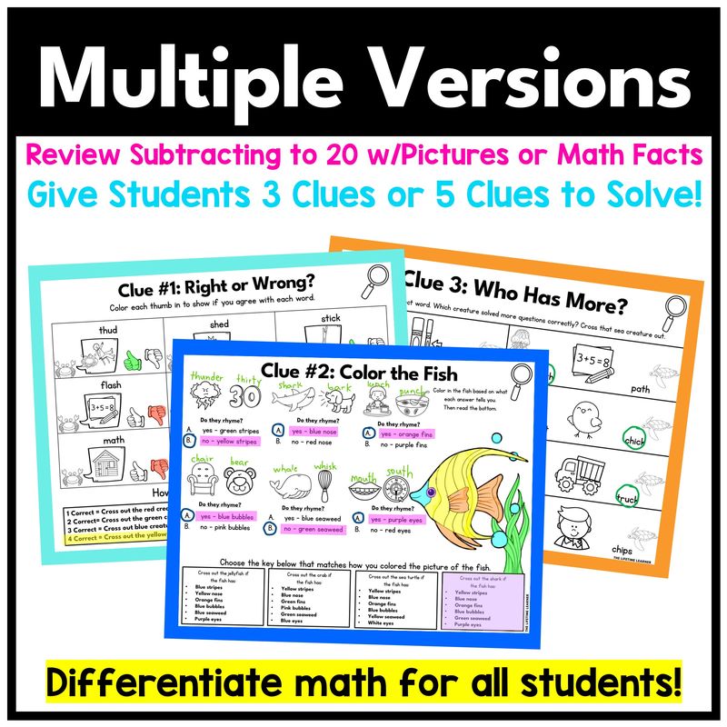 Need enrichment? A bonus mystery is included that focuses on addition and subtraction facts to 20. While the rest of the class completes the main mystery, higher-level students can work on this extra challenge.