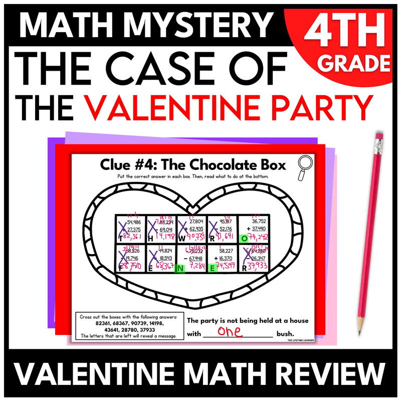 Teachers want math review activities that keep students engaged while building mastery. This 4th grade Valentine’s Day math mystery transforms routine worksheets into an interactive game where every problem brings students closer to solving the mystery.