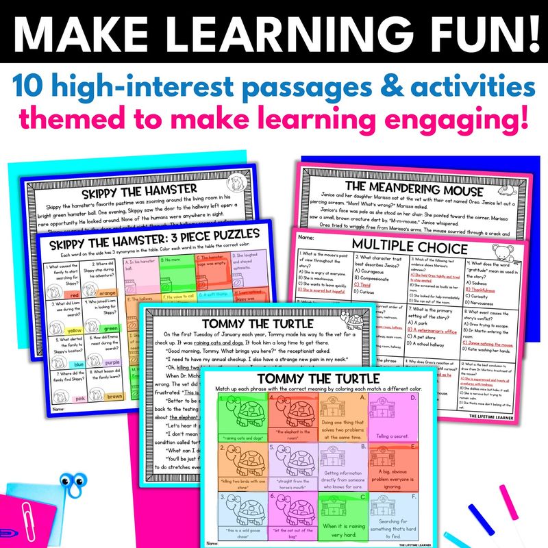 Are you looking for ELA animal themed reading passages 3rd, 4th, and 5th grade students will actually WANT to read? Make learning FUN with these 10 pet-themed reading comprehension passages and activities! Use this “veterinarian add-on pack” of fiction reading passages to spiral review literature reading skills during your ELA block OR during a pet hospital classroom transformation. They’re appropriate for third, fourth, and fifth graders or students who aspire to be vets or love animals!