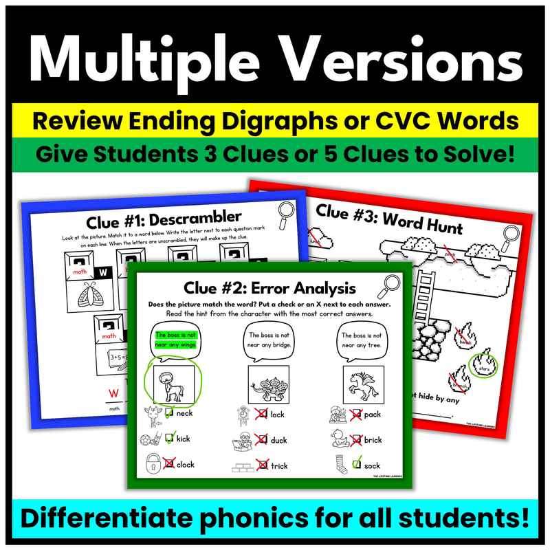 Looking for differentiation? Each resource includes a bonus mystery focused on CVC words. While most of the class works on the main phonics skill, students who need extra practice with CVC words can complete this version instead. The bonus mystery is designed to look and feel exactly like the main one, with the same style of clues and the same final solution. This way, every student is engaged in the same mystery storyline, but the skill level can be adjusted to meet their needs seamlessly.