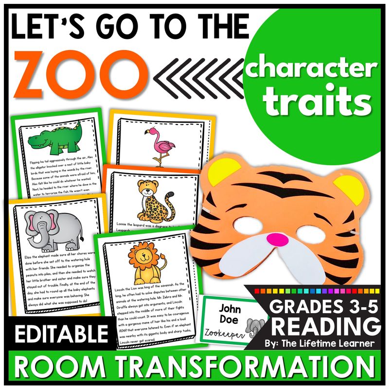 It’s zoo reading day in this engaging zoo room transformation or reading escape room! 3rd, 4th, and 5th graders read fiction paragraphs and identify 30 character traits in a FUN way with tons of zoo theme reading activities! This EDITABLE zoo animals classroom transformation has lots of zoo task cards / zoo activities including character traits practice, character traits task cards, and a character traits list. It’s the perfect activity to use during a zoo unit and includes a zoo write the room page as well as zoo animal coloring pages and zoo decor. Print and digital versions are included.