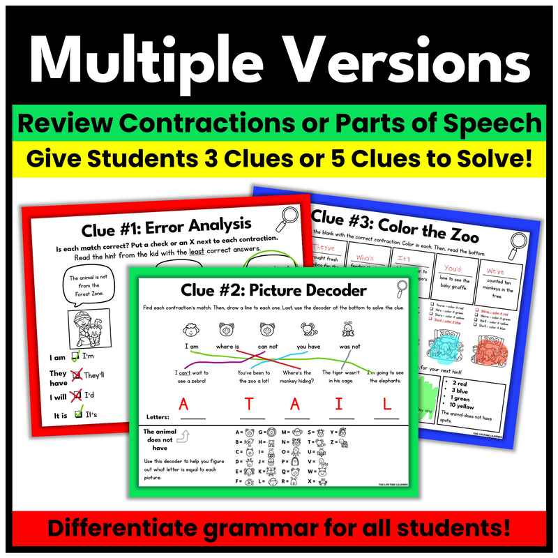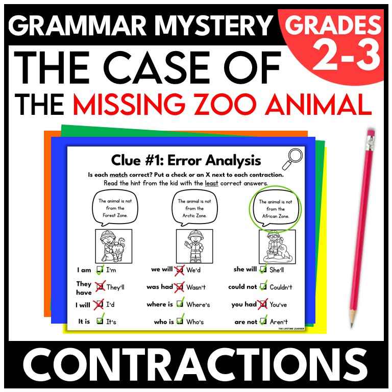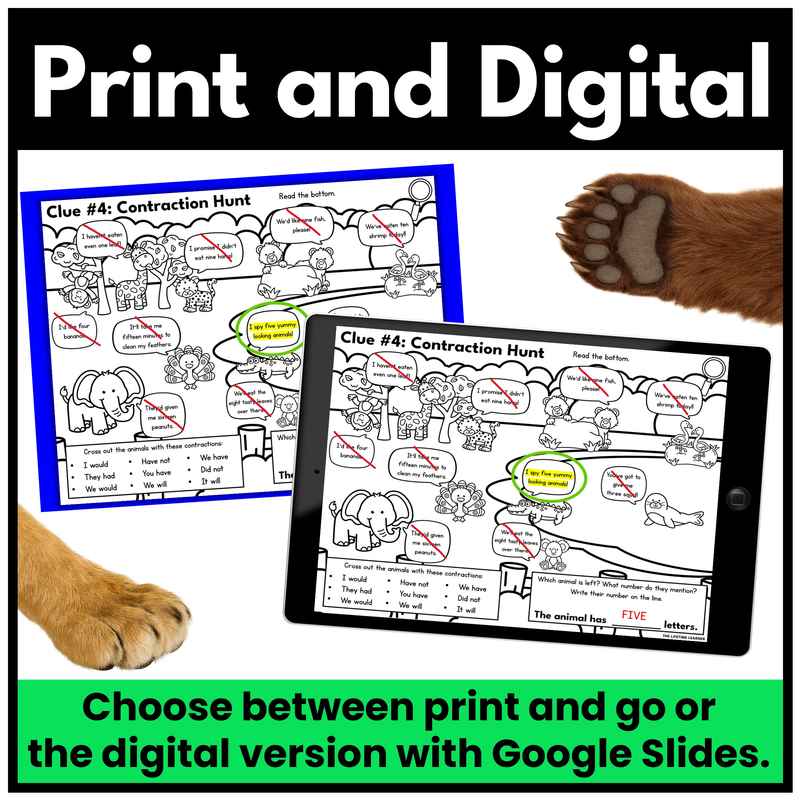 This contractions grammar mystery 2nd and 3rd grade students love is a fun and engaging way to practice grammar skills! Designed as a zoo escape room game, students solve clues that are interactive and exciting. These printable and digital grammar worksheets turn reading practice into a reading mystery game for second and third grade. Use it during whole group, centers, small groups, partners, or as part of a classroom transformation.