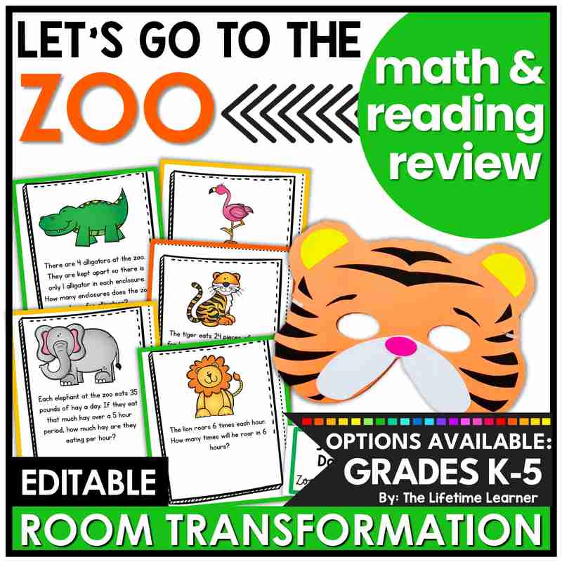 Transform your classroom into a fun themed learning activity with this zoo math and reading classroom transformation! Engage your students with 20 zoo activities (10 math and 10 reading). Choose any grade K-5 and receive both subjects! Filled with math and reading worksheets, this themed learning day includes zoo door decor, name tags, and posters. It’s also perfect as a zoo math or reading escape room alternative! Print and digital versions are included.