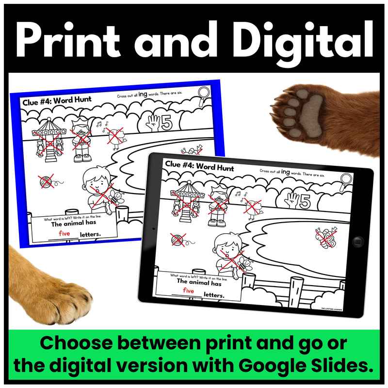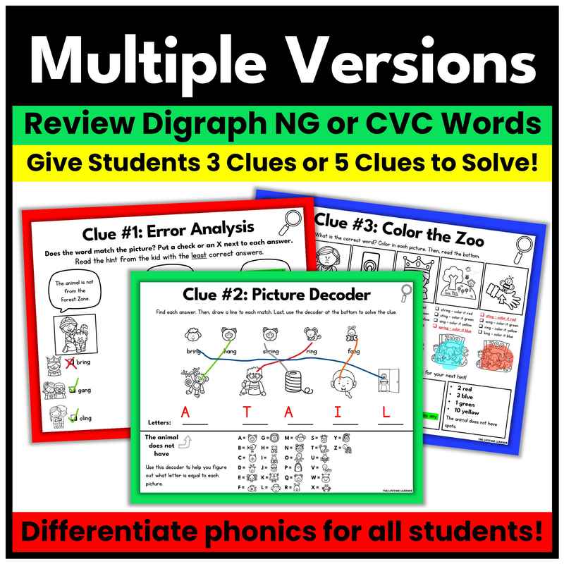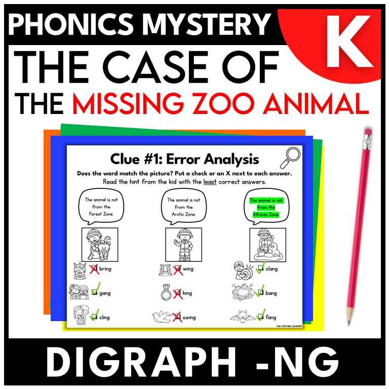 This zoo phonics mystery kindergarten activity is a fun and engaging way to practice the skill: digraph -ng! Designed as an escape room game, student detectives solve clues that are engaging and fun. These printable and digital phonics worksheets turn reading practice into an interactive mystery game for kindergarten and 1st grade. Use it during whole group, small groups with teacher support, or as part of a classroom transformation.